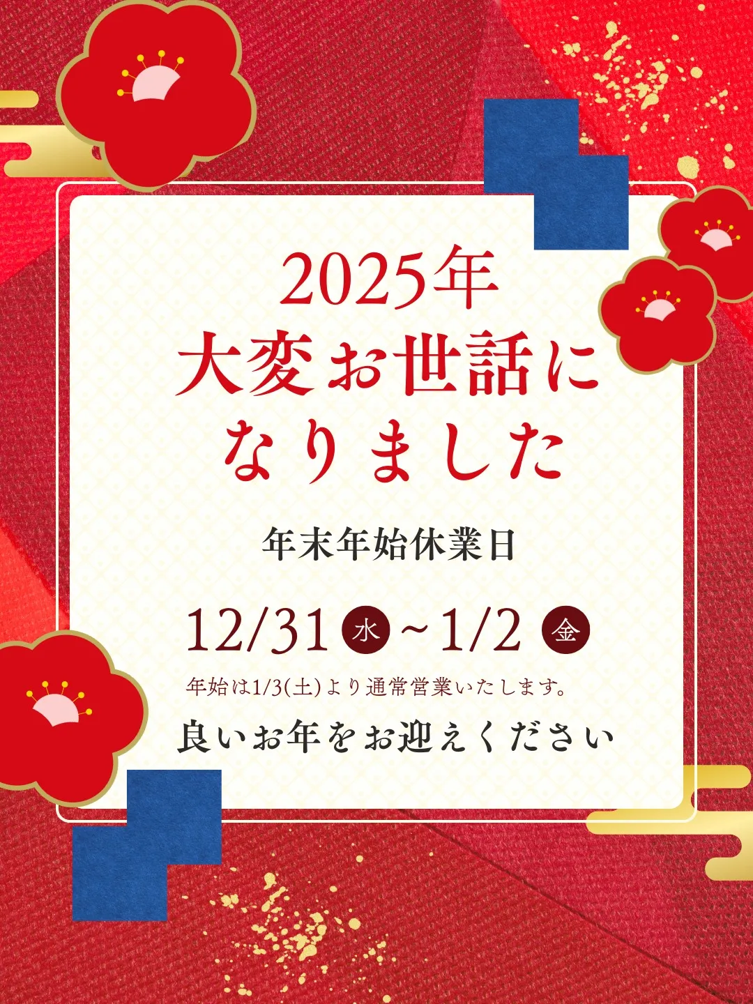 年末年始休業日のお知らせです。
